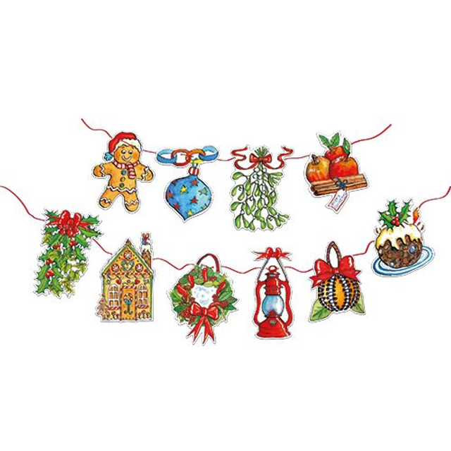 Bunting - 2x10 designs making 20 images in each pack. 4 metres of ribbon in each pack. Precut and pops straight out and holes already for the ribbon to be threaded. Looks great hung over the mantlepiece, strung from a beam, down the stairs or from an archway. Where could you hang yours?
